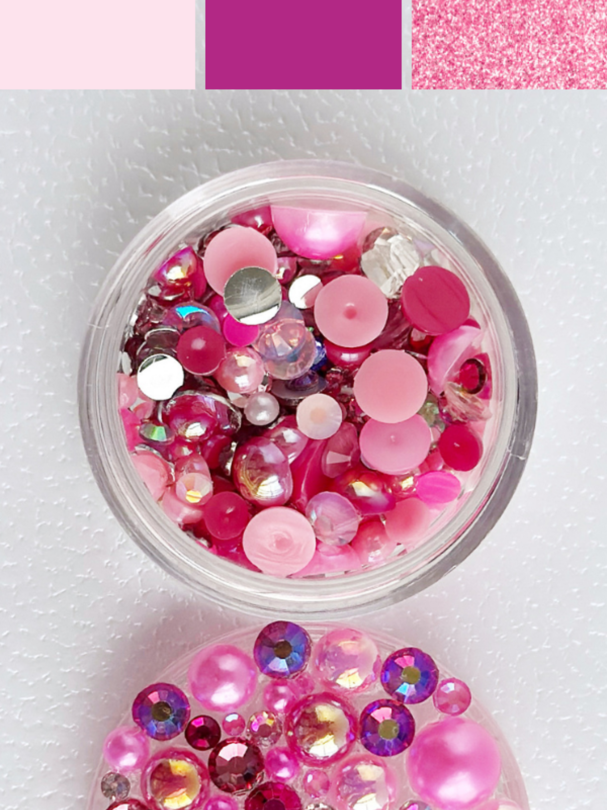 Each 20g bag of embellishments includes an assorted mix of 800 to 1,200 flatback acrylic rhinestones and pearls (2mm - 10mm), covering approximately 30 - 50 square inches depending on spacing and project style.
